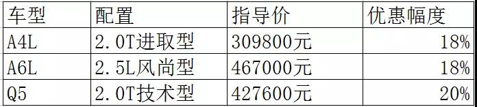 我们从一位奥迪销售人员手中拿到了最新的终端优惠幅度,其中优惠幅度最大的奥迪Q3 2.0T 四驱运动型,优惠幅度达到了23%,也就是常说的7.7折。而被消费者最为熟知的奥迪A4L、奥迪A6L以及奥迪Q5车型的最大优惠幅度分别达到了18%、18%以及20%。而奥迪A5在官降之后的优惠幅度依然达到了6%-12%,什么意思呢?就是官降幅度还没人家终端优惠幅度高呢。