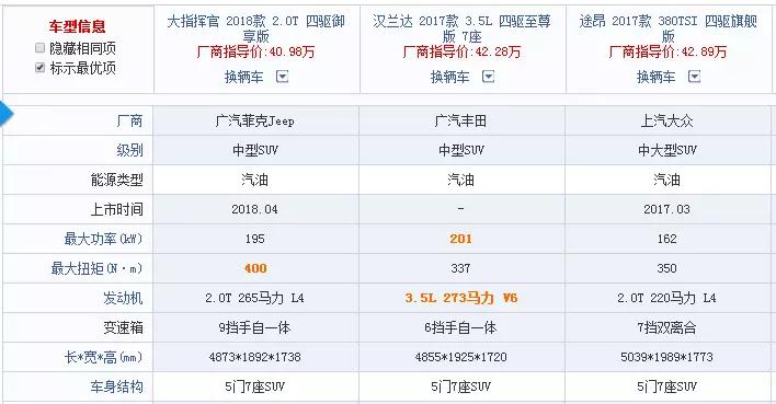 Jeep大指挥官的顶配版车型,拥有专属外观设计,Ultrasuede® 麂皮质感+Nappa豪华打孔真皮座椅、专属绒面包覆顶棚及AB柱,意大利进口七层工艺斑马纹实木装饰等成本极高的装备,甚至还装备了同级罕有的哈曼卡顿®19扬声器音响系统,综合价值感甚至堪比50万的豪华品牌水准。反观汉兰达与途昂,先不说他们40万的车型均不是顶配,动力还比Jeep大指挥官更逊一筹,更别提各种豪华配置了。