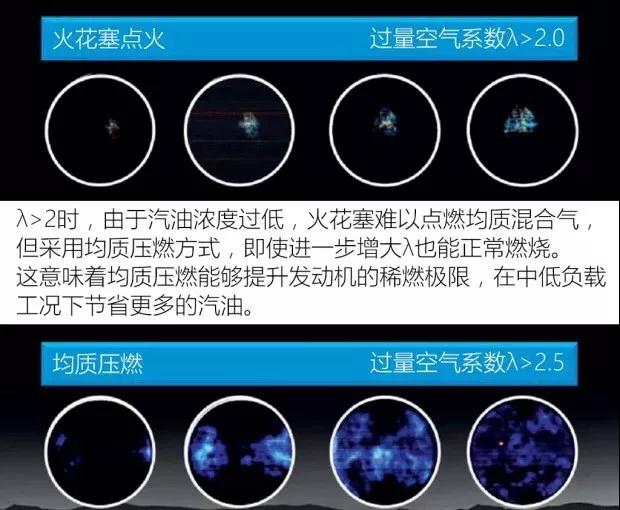 传统发动机的另一个现象就是实际的燃料和空气的混合物中,空气的比例较小,所以燃料不能完全燃烧,因此会造成一定的浪费。而SKYACTIV-X同时还采用了稀薄燃烧,也就是提高空燃比(空气和燃料的比例),这样不仅可以尽可能高效的利用燃料,另外由于燃烧更充分,氮氧化物的排放也会下降。