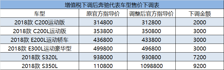 上图为奔驰品牌的一些主销车型在增值税下调后的售价。我们可以看出30万-50万元售价的车型基本下调了2000-3000元,这样的幅度大概能占到售价的0.6%左右。