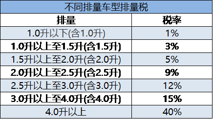 我们都知道进口车进入到国内需要缴纳关税、消费税和增值税。其中关税税率为25%,消费税也称排量税,根据进口车型不同排量而定(具体如下图),增值税税率为16%。