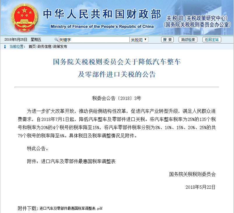 2018年05月28 11:33 来源:蜀锦传媒 邓彬5月22日,财政部在官网上发布了《关于降低汽车整车及零部件进口关税的公告》。公告称,自2018年7月1日起,降低汽车整车及零部件进口关税。将汽车整车税率为25%的135个税号和税率为20%的4个税号的税率降至15%,将汽车零部件税率分别为8%、10%、15%、20%、25%的共79个税号的税率降至6%。