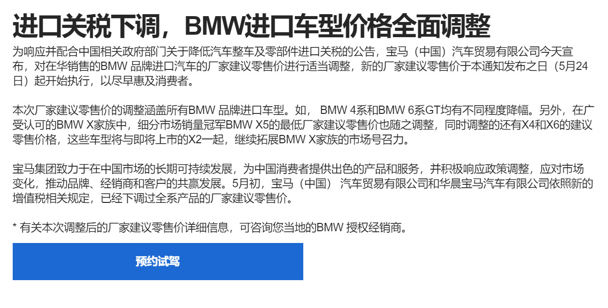 关于降低汽车整车及零部件进口关税的这则通告是5月22日发出的,并且将于7月1日起开始实行。所以在7月1日以前报关和清关的所有进口车辆则没有享受到关税下调的好处,也就是说在7月1日进口的所有车辆都缴纳了正常的关税。又由于5月22日到7月1日时间比较短,并且关税下调幅度较大对车价的影响也将较大,若汽车销售公司在7月1日前不对指导价进行下调的话则会导致原本打算购买进口车的消费者持币待购。