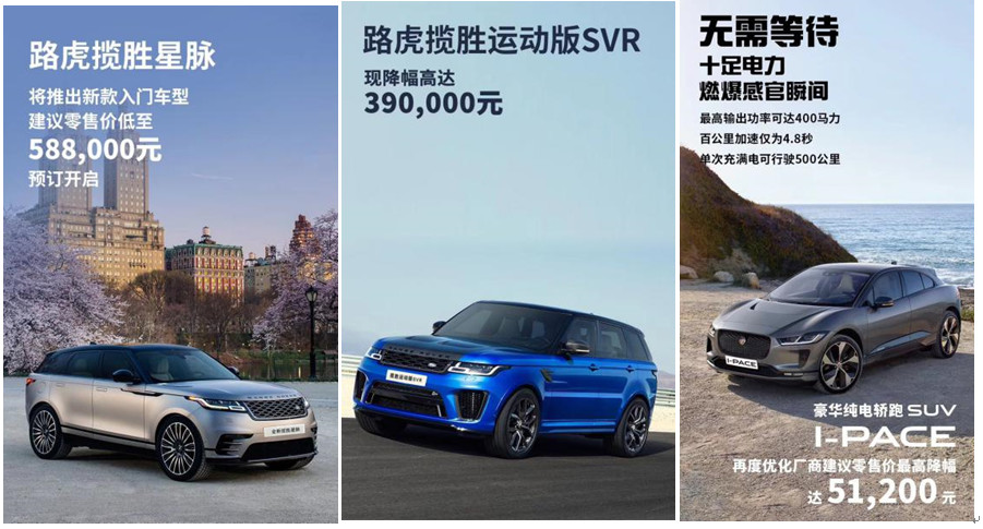 全尺寸豪华7座SUV路虎新款发现厂商建议零售价为688,000元起;揽胜星脉在现有车型厂商建议零售价降低的同时,还将推出一款搭载Ingenium 2.0升发动机的新车型,厂商建议零售价将低至588,000元起,并立即开始订售;捷豹F-PACE的最低厂商建议零售价下探至488,000元。