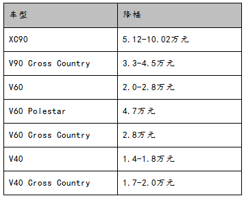 沃尔沃XC90最大降幅达到10.02万元;豪华越野旅行车V90CC最大降幅4.5万元,具体情况如下:
