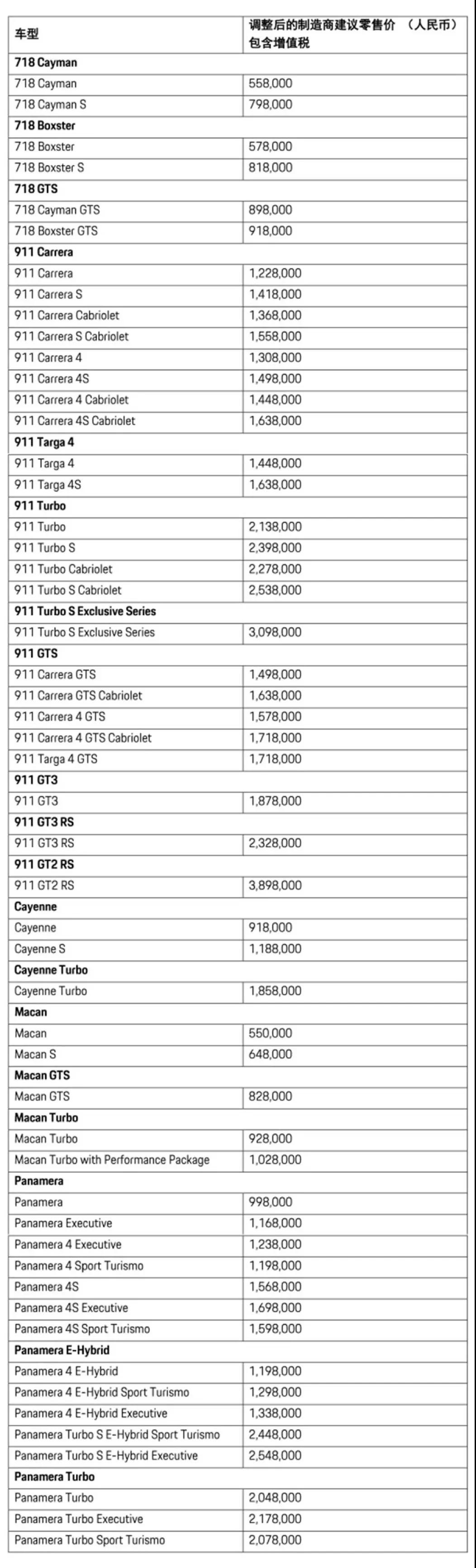 日前,保时捷官方公布了关税调整后新车的最新价格,调整后保时捷品牌在国内的起步价格降低到55.00万元(Macan),此前售价为410.6598万元的911 GT2 RS调整后的售价为389.8000万元,降价幅度达到了20.8598万元。