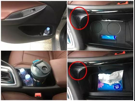 除了门板和中控上的传统储物空间以外,杯架下方还有一个小亮点的设计,刚好可以放进去一包抽纸,预留了拿纸的小缝隙,对于家用来说这个设计可以说十分贴心。而且开启的按键也非常有质感。