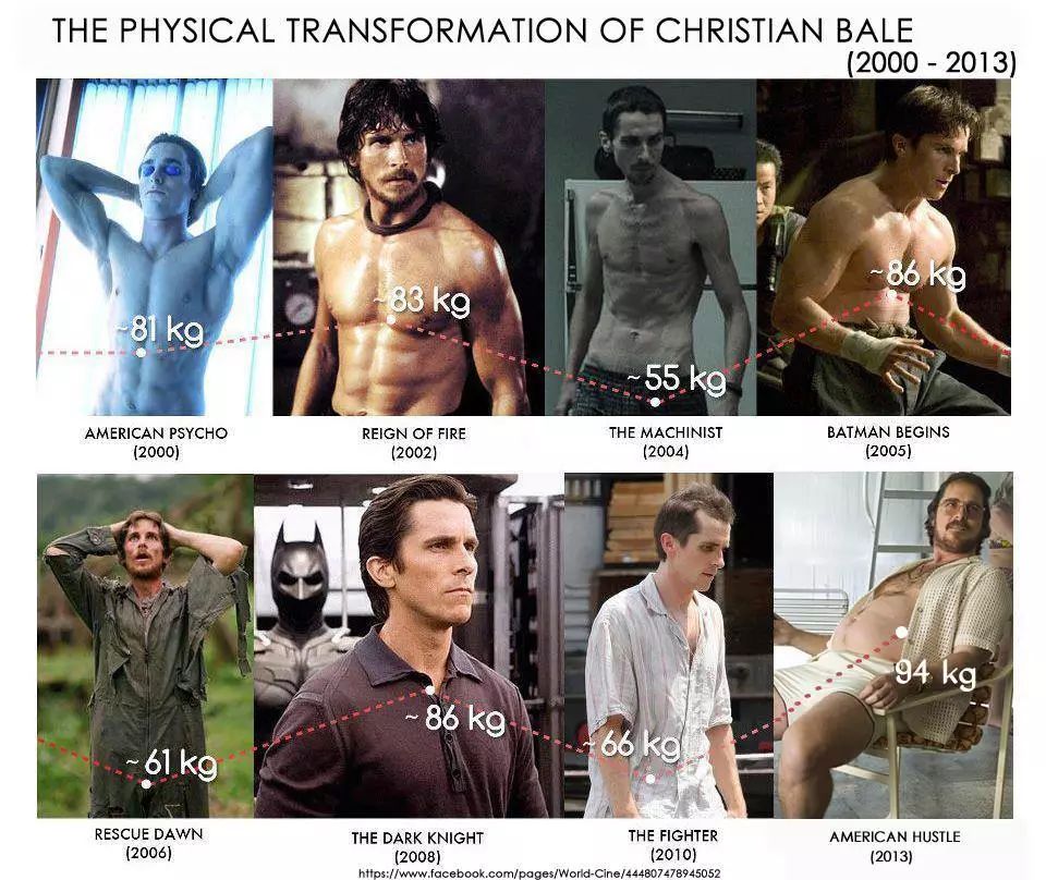其实这一点很重要,我们至今还能觉得这几位导演和演员充满生命力,是在于诺兰在《蝙蝠侠》之外还有《敦刻尔克》和《盗梦空间》;杰克逊在结束了金刚狼生涯之后,还能重拾歌舞剧《大马戏家》;而贝尔,他可是好莱坞里出了名的“橡皮人”,能为《机械师》在两周之内减重57斤瘦到皮包骨头,然后紧接着为了《蝙蝠侠》在往身上添60多斤的肌肉。