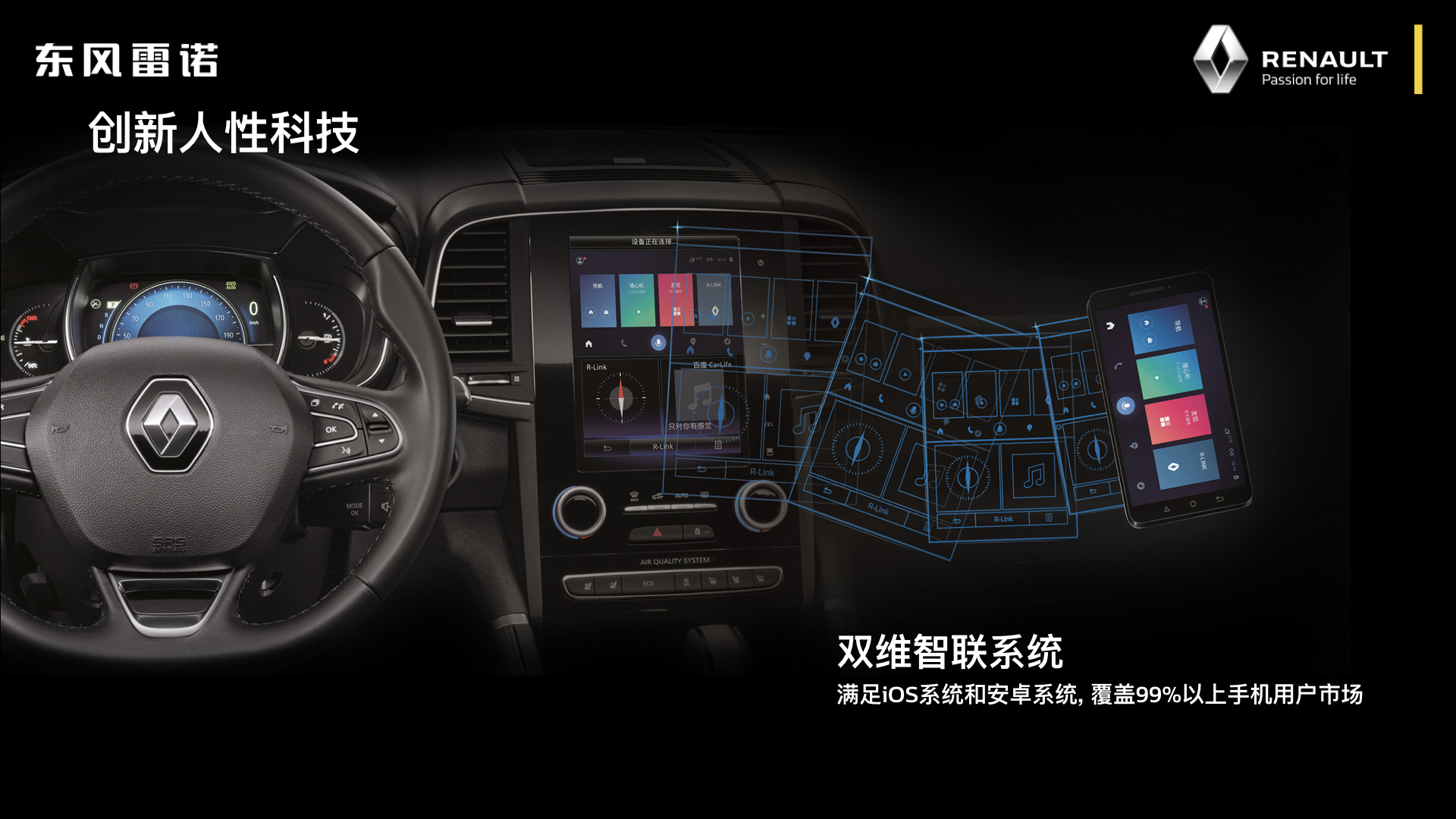 其次,人性化设计带来暖心呵护。2018款科雷傲一大核心亮点即是其创新性搭载的“双维智联系统”,它在R-Link® 2多媒体系统中新增CarLife功能,只需通过USB即可让采用安卓系统的智能手机终端与座驾无缝链接,与原有基于iOS系统的CarPlay一起实现对安卓与iOS两大智能手机操作系统的全覆盖。此外,通过CarLife内置语音系统,R-Link® 2还能够轻松完成实时导航、蓝牙电话、音乐播放等功能的即时操作,智能水平的提升让一家人在车里的时光更丰富多彩。