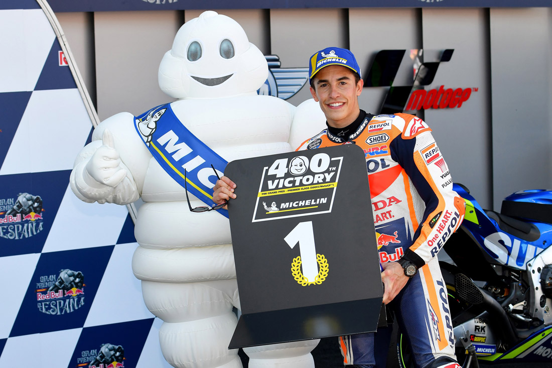 为庆祝MotoGP的第400场胜利,米其林轮胎先生首次亮相MotoGP庆典现场,并赠送马尔克斯一顶米其林棒球帽,祝贺其夺冠。