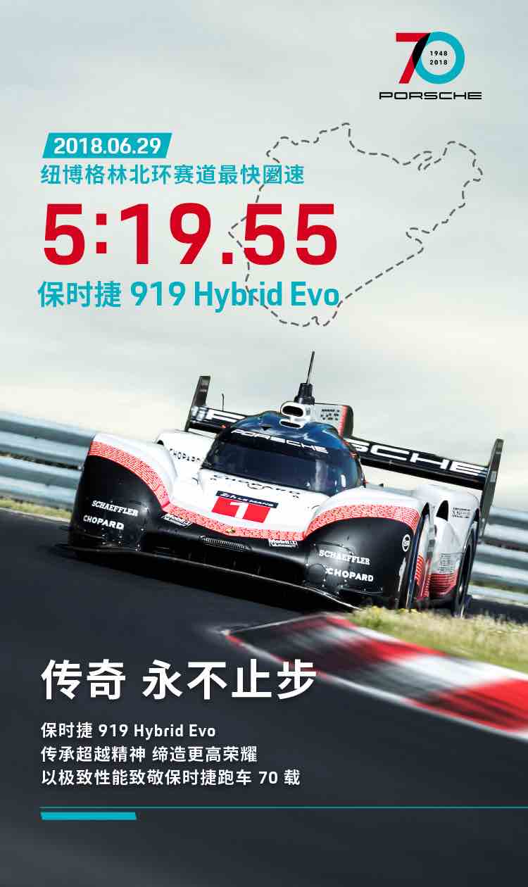 2018年07月03 11:51 来源:蜀锦传媒随着秒表上5分19秒55数字的定格,37岁的德国车手Timo Bernhard驾驶保时捷919 Hybrid Evo风驰电掣般冲过了纽博格林北环赛道的终点线,在“绿色地狱”创造出全新的圈速纪录。