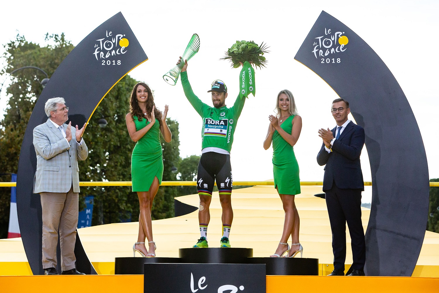 斯柯达已连续四年赞助环法自行车赛“绿衫”获得者、最佳冲刺选手。斯洛伐克选手彼得·萨甘(Peter Sagan)连续第六年赢得这项荣誉。与环法总冠军奖杯一样,最佳冲刺选手获得的奖杯也由斯柯达汽车设计、在捷克制作。从2011年开始,斯柯达一直为环法自行车赛设计奖杯。奖杯高60厘米、重4公斤,由捷克著名水晶公司琅世唯(LASVIT)制造。设计优雅、制作精美的奖杯已成为环法自行车赛标志性的传统之一。虽然每年奖杯的规格不变,但斯柯达设计师总能提出全新的创意。今年奖杯的设计灵感来自捷克立体主义风格的几何图案和棱角形状,令人耳目一新。