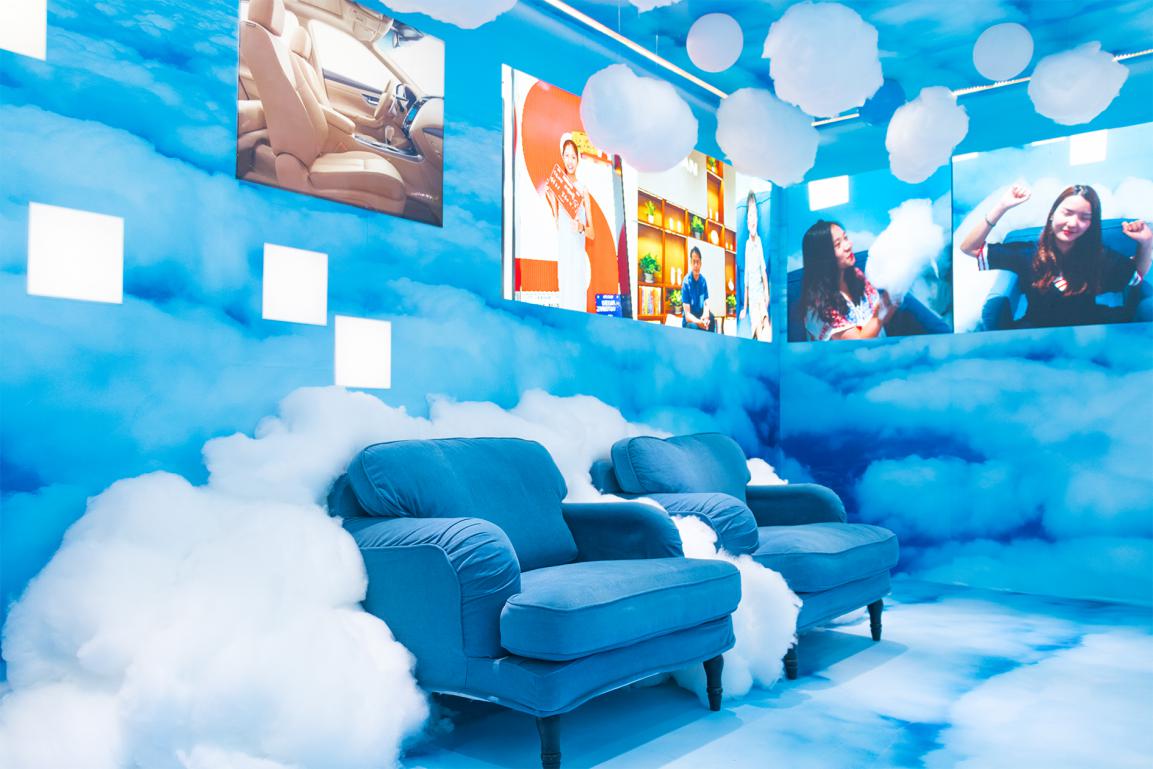 携手影像艺术家汤辉打造的乘坐舒适区——“云端沙发”,以蓝天白云为主题,运用大片清新的蓝、白色系,其中亮眼飘浮的蓝白气球更增添许多少女心。如此环境配合天籁同款座椅,为乘客打造了一个梦幻般的舒适乘坐环境。