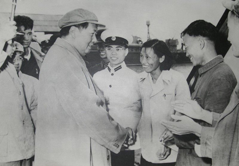 图为毛主席视察芜湖造船厂接见工人代表