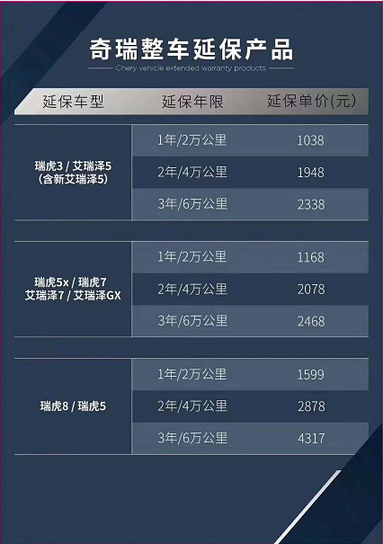 奇瑞汽车延保服务共设置了三种套餐,每种套餐针对不同车型单价不同,多种选择任你挑,价格优惠更超值。