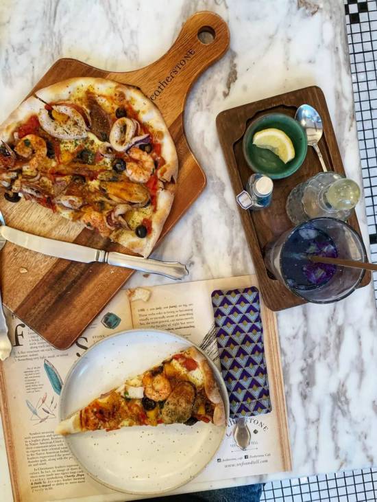 Featherstone最出名的就是颜值超高的苏打水,用香水瓶一样的玻璃瓶呈现。每一款饮品杯中都放满花瓣冰块配上漂亮的玻璃瓶,精致治愈得不行。下午5点以后就是晚餐时间,我点了一份海鲜匹萨简直太好吃了,料也十足,等待大概半小时以上才能新鲜出炉也是值得。