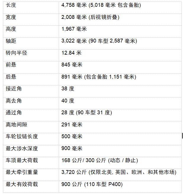 全新一代路虎Defender车身高度比路虎现有的系列大型SUV提高了20毫米;对新增的电池和冷却电路等元件的位置进行了优化;因此,路虎工程师能最大化缩短车头和车尾,使接近角和离去角分别达到38度和40度。110车型的轴距为3,022毫米(比路虎发现轴距长99毫米),通过角28度 (90车型为31度),堪称世界顶级的越野“黄金几何”设计。