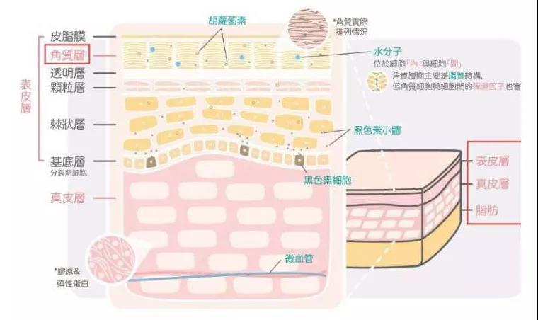 我们的皮肤分为表皮和真皮,又细分为4-5层,其中比较重要的是最外层的角质层。角质层其实是皮肤一层层堆叠的死亡细胞紧密地连接起来的结构,就像一堵墙一样,主要起着保护的作用。角质层能够隔离外界不良的刺激和病毒,还能起到保湿和防晒的作用。在角质层的最外面,还有一层由皮肤分泌的油脂、细胞分泌的分泌物、脂质、汗液及灰尘等组成的皮脂膜,也起着保护、滋润和隔离的作用。