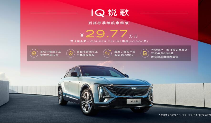 今日,上汽通用汽车凯迪拉克品牌宣布,IQ锐歌全新车型——后驱标准续航豪华版正式上市,售价29.77万元起。...