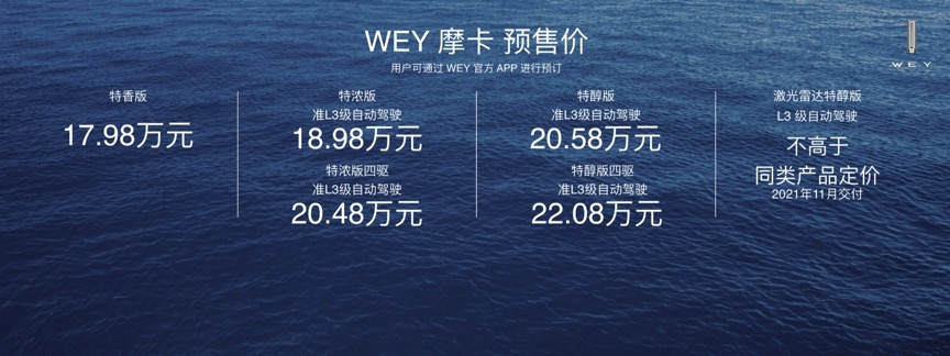 2021年4月19日,“智动WEY来”WEY品牌“摩卡”预售发布会,在第19届上海车展盛大举行。WEY旗下首款率先应用“咖啡智能”的全新旗舰车型摩卡,正式开启预售,全系共推出特香版、特浓版、特浓版四驱、特醇版以及特醇版四驱共五款车型,预售价格分别为17.98万元、18.98万元、20.48万元、20.58万元以及22.08万元,以触手可及的价格,实力打造“全民爆款”。作为同级首个实现高阶自动驾驶的量产车,摩卡将助力WEY加速布局智能出行领域,实现自我颠覆超越,让科技洞悉人心。