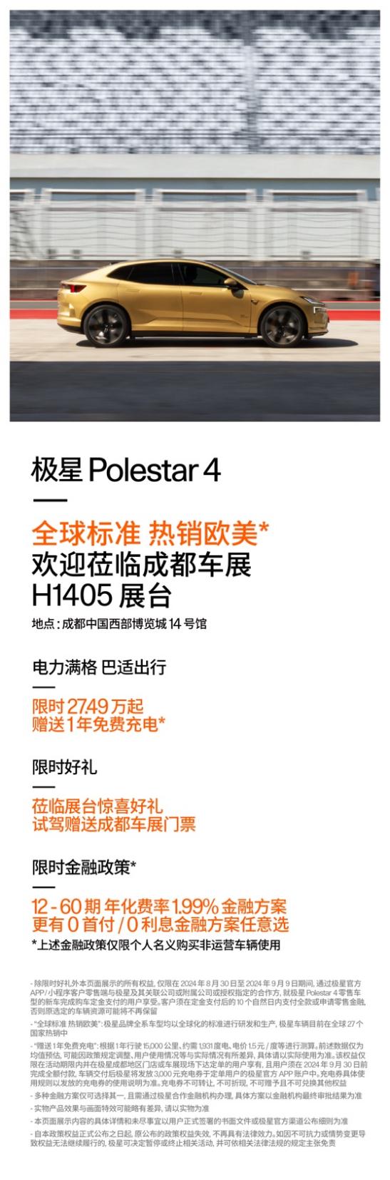 即刻预约试驾极星Polestar 4,不仅能抢先体验非凡驾驭魅力,还有机会获赠成都国际车展入场券,成都地区车展期间购车更可限时尊享专属优惠。