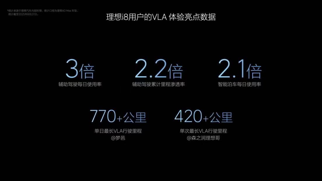 自8月20日理想i8与VLA司机大模型同步交付以来,市场反响热烈。首批理想i8用户中的单日最长VLA行驶里程超770公里,单次最长VLA行驶里程超420公里。VLA随理想i8上市交付后,辅助驾驶每日使用率提升3倍,累计里程渗透率提升2.2倍,泊车每日使用率提升2.1倍,也意味着VLA司机大模型成为了用户真的爱用且好用的辅助驾驶。