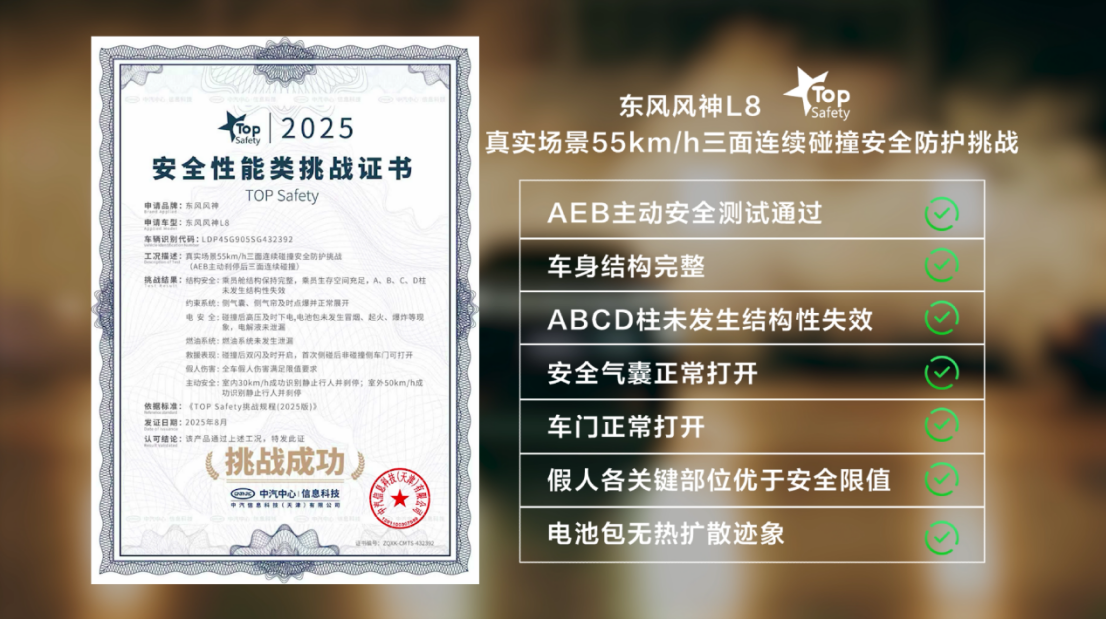 当然,长情的陪伴,更要给全家人靠得住的安全感。东风风神L8品质过硬、用着安心,给移动的家提供超理想的安全保障。东风风神从不把安全当口号,而是用“魔鬼测试”和真金白银铸就央企品质。全网首次三面连续高速碰撞测试的视频,一亮相即震撼全场——风神L8在极端事故中,AEB极速响应,即使被三车连续撞击,高强度钢强化的笼式车身也能保证ABCD柱结构完好,乘员生存空间充足,侧气囊及气帘瞬间弹开,全方位守护驾乘者。得益于军车级的坦克装甲和四重电芯强化,马赫电池更是表现出色,碰撞后无起火、无爆炸、无冒烟。这种“硬碰硬“的硬实力,正是全家想要的安全感。