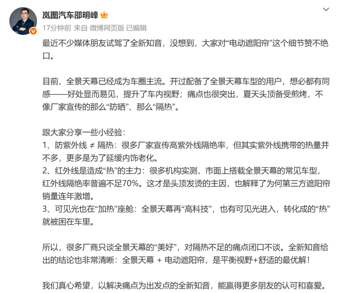 岚图汽车邵明峰之前就多次表示,新能源车不能只给用户全景天幕,却不给遮阳帘。很多用户饱受“头顶煎烤”之苦,被迫自掏腰包购买第三方遮阳帘。“你在哪家买的防晒膜,发我个链接呗”成为车主社群的常见求助,相关配件售价不菲。