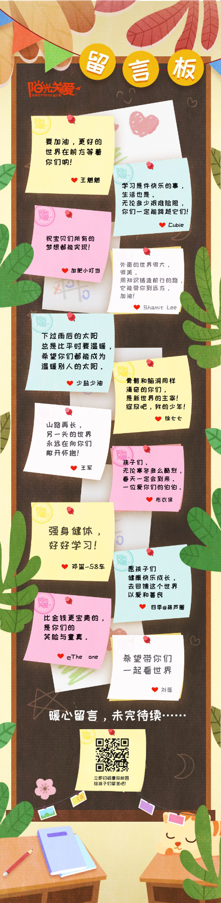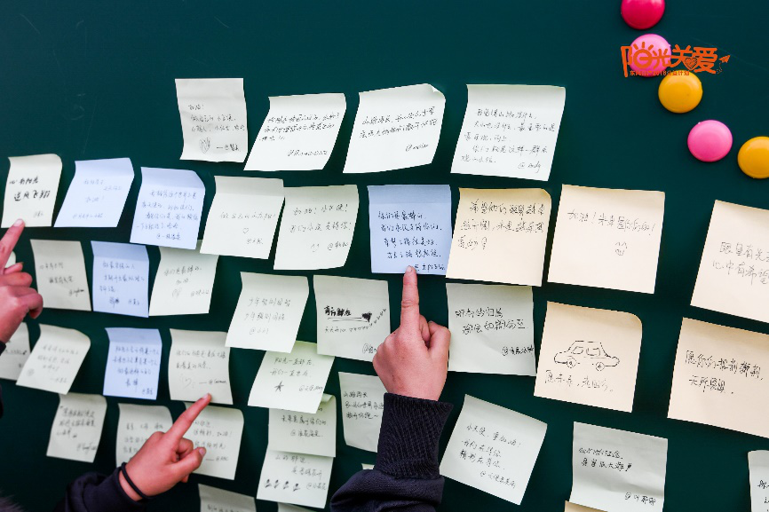 在活动当天,我们也把这些留言带到了改造的“阳光童梦教室”,让孩子们在这个启迪思维、点燃梦想的空间,感受来自社会的温暖,照亮童梦。