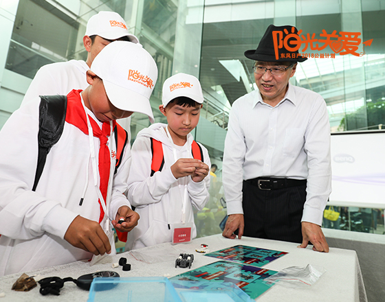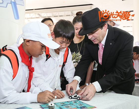 得知小记者们的兴趣点,东风日产总经理埃尔顿·谷硕、党委副书记潘治清等领导来到了“天马行空”展区的筑梦课堂上,向阳光小记者贴心讲解汽车知识,并共同完成了小汽车的组装,让他们能够零距离感受到汽车制造的魅力。