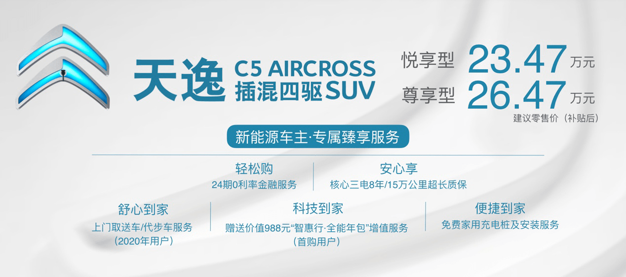 此外,东风雪铁龙针对天逸PHEV上市推出了多项尊享服务,包括24期0利率金融服务、核心三电8年/15万公里超长质保、免费家用充电桩及安装服务等,并针对首购用户赠送价值988元“智惠行﹒全能年包”增值服务,针对2020年购车用户提供上门取送车和代步车服务。